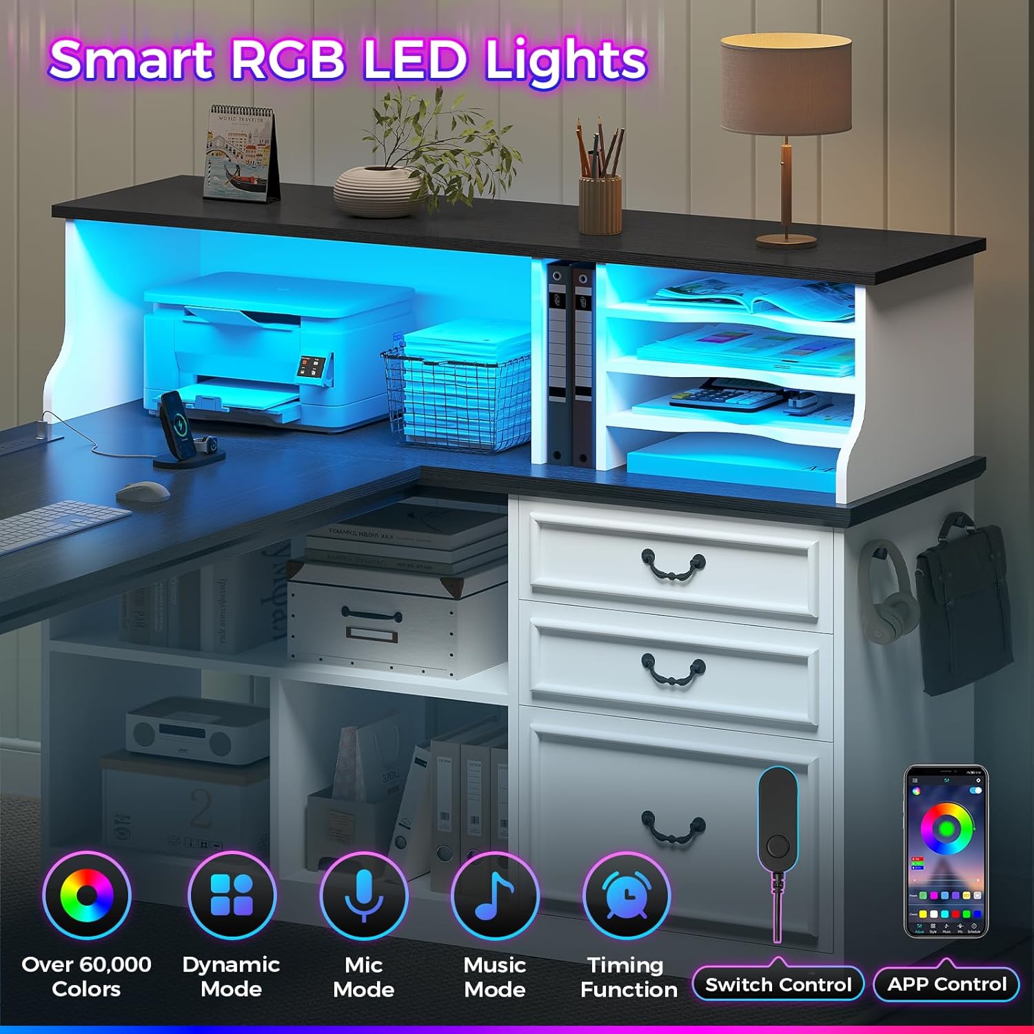 61" Executive Desk, Farmhouse L Shaped Computer Desk with Power Outlets and LED Light, Home Office Desk with 3 Drawers and 4-Tier Paper Organizer, White