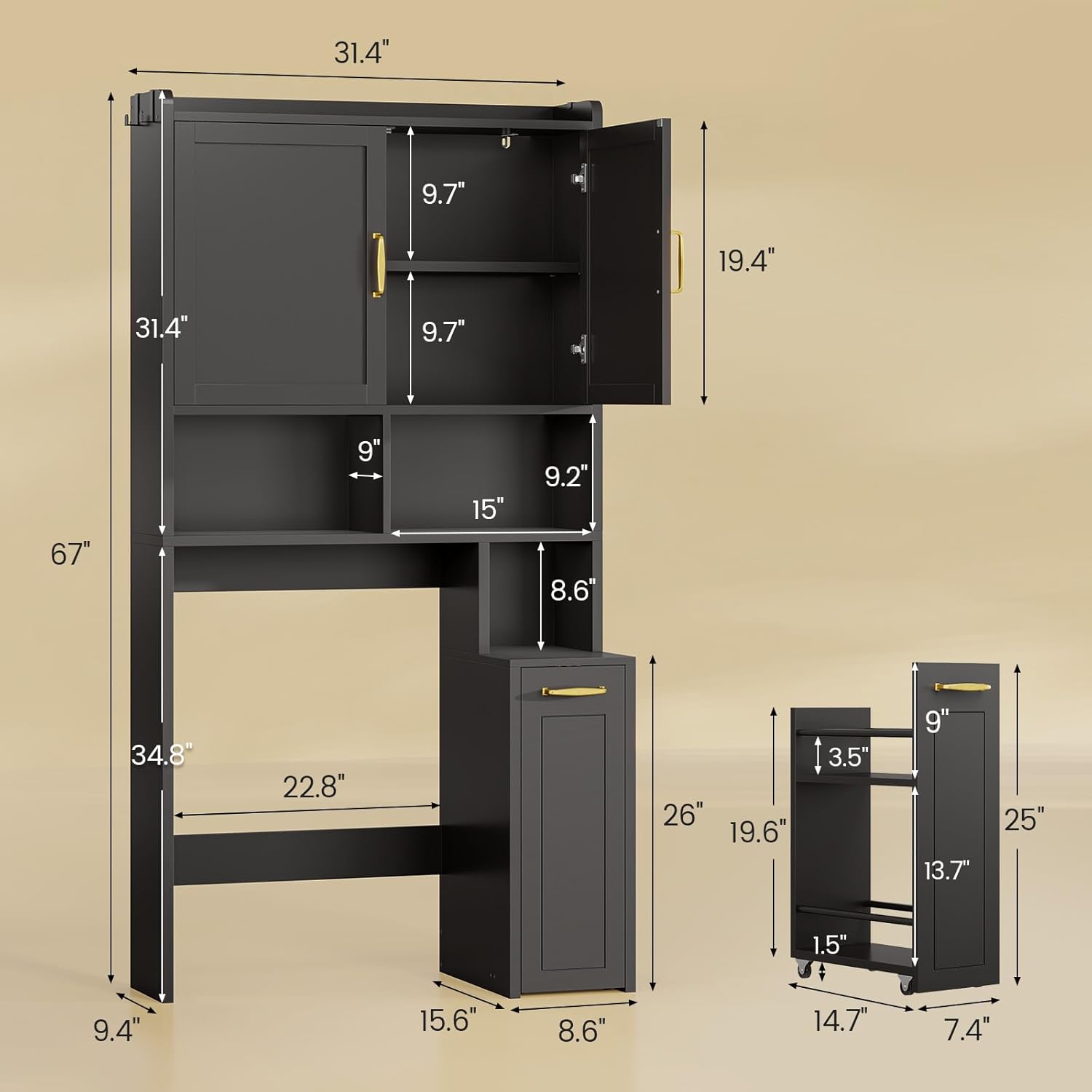 - 【Ample Storage Space】This cabinet above toilet comes with 1 cabinet to hide the essentials and also includes 2 open shelves in the middle. 1 paper towel holder box and bottom with casters, small.